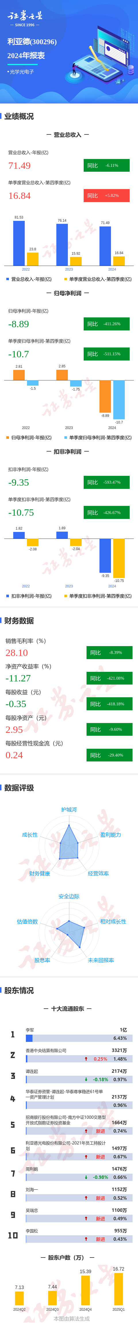 证券之星消息,利亚德2024年年报显示,公司主营收入71.5亿元,同比下降6.11%;归母净利润-8.89亿元,同比下降411.26%;扣非净利润-9.36亿元,同比下降593.48%;其中2024年第四季度,公司单季度主营收入16.85亿元,同比上升5.83%;单季度归母净利润-10.71亿元,同比下降511.16%;单季度扣非净利润-10.76亿元,同比下降426.67%;负债率40.58%,投资收益-1421.05万元,财务费用708.38万元,毛利率28.1%。